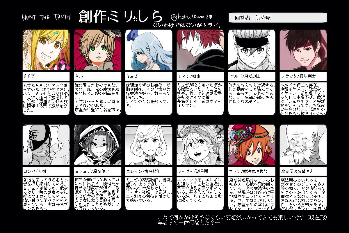ルミナちょんと肉 の 「hunt the truth」 で ミリしら!(二次創作的な遊びです、公式に掠りもしていないことが堂々と書いてあります)